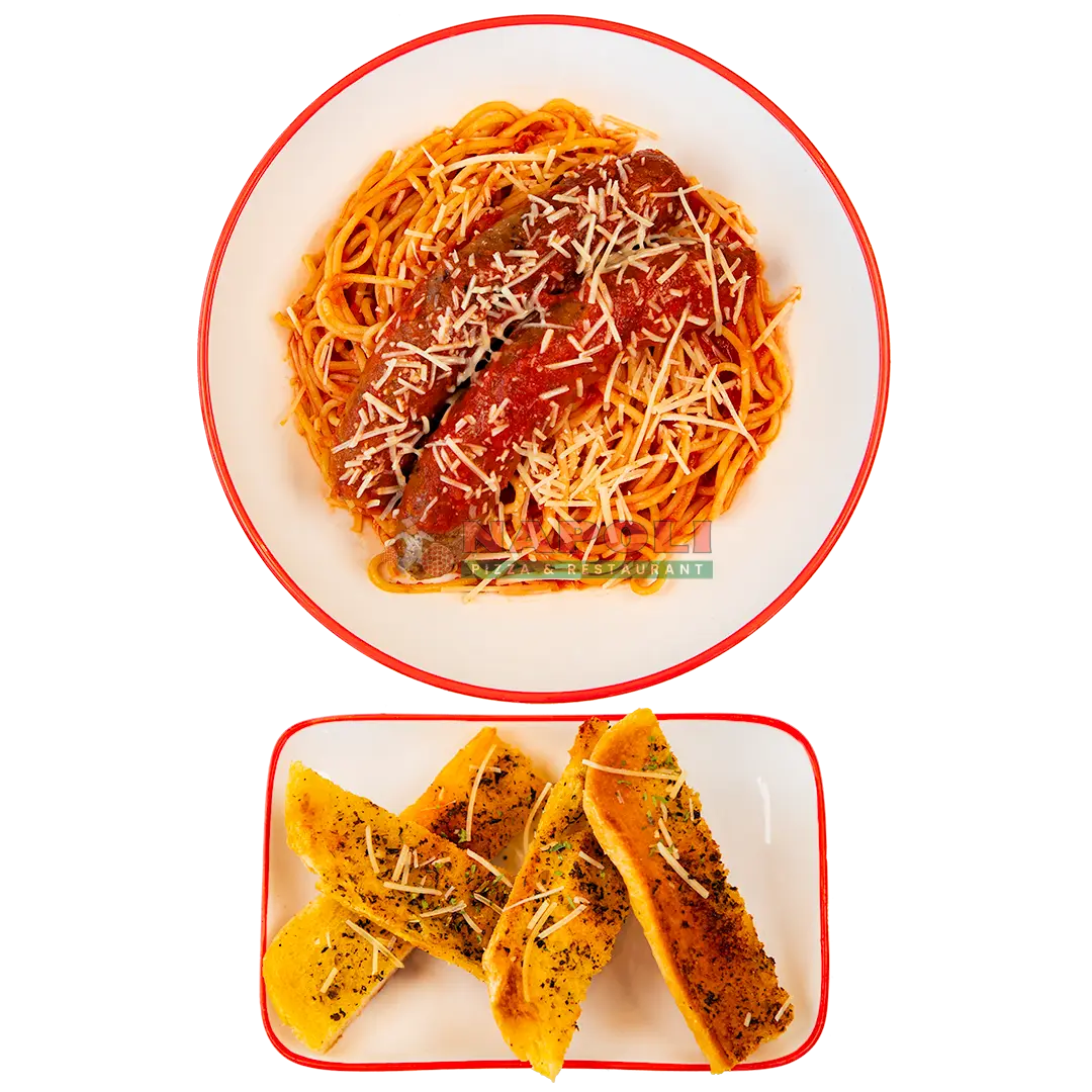 Spaghetti w/Sausage + Garlic Bread