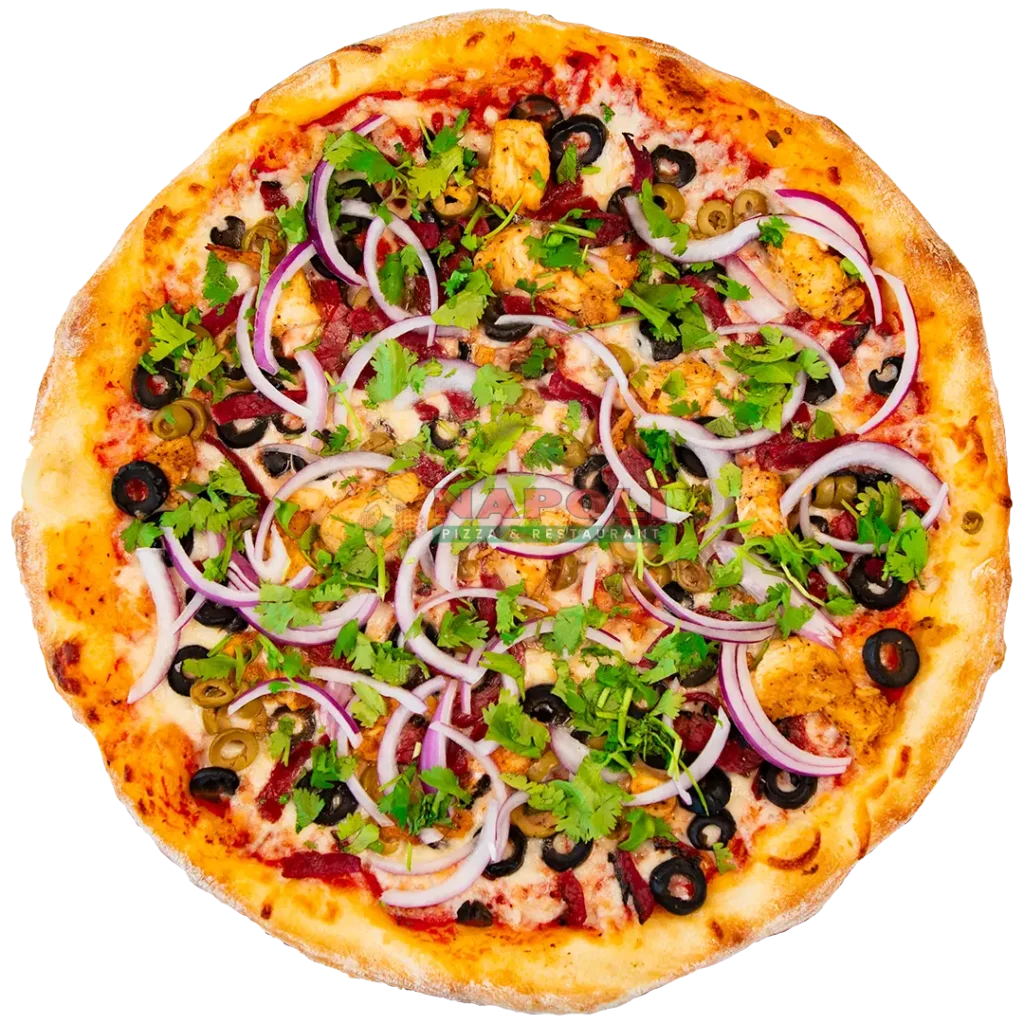 Pastrami, Grilled Chicken, Green Olive, Black Olive, Fresh Red Onion & Fresh Cilantro