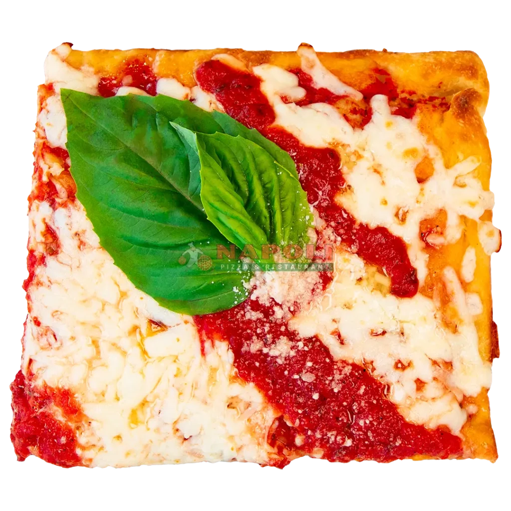 Distinct thin, rectangular style of pizza attributed to Long Island, New York. Topped with mozzarella cheese, tomato sauce & finished with fresh basil!